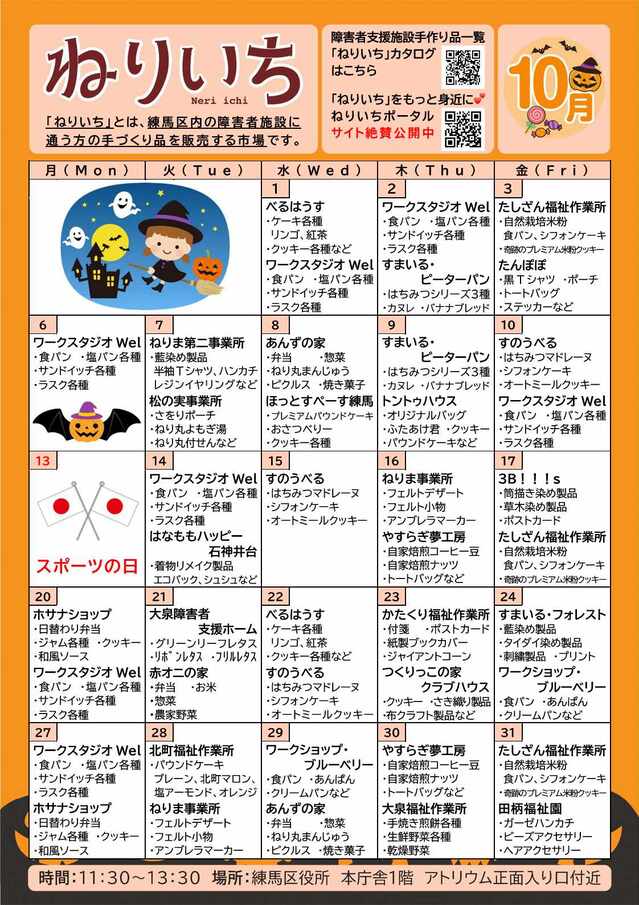 2025/09/29 (月)ねりいち 令和7年10月の販売予定 場所:区役所本庁舎1階アトリウム正面入り口付近 営業日:毎週月曜、火曜、水曜、木曜、金曜(祝日を除く) 開催時間:午前11時30分から午後1時30分 ※担当施設やスケジュールが急きょ変更になる場合があります。あらかじめご了承ください。