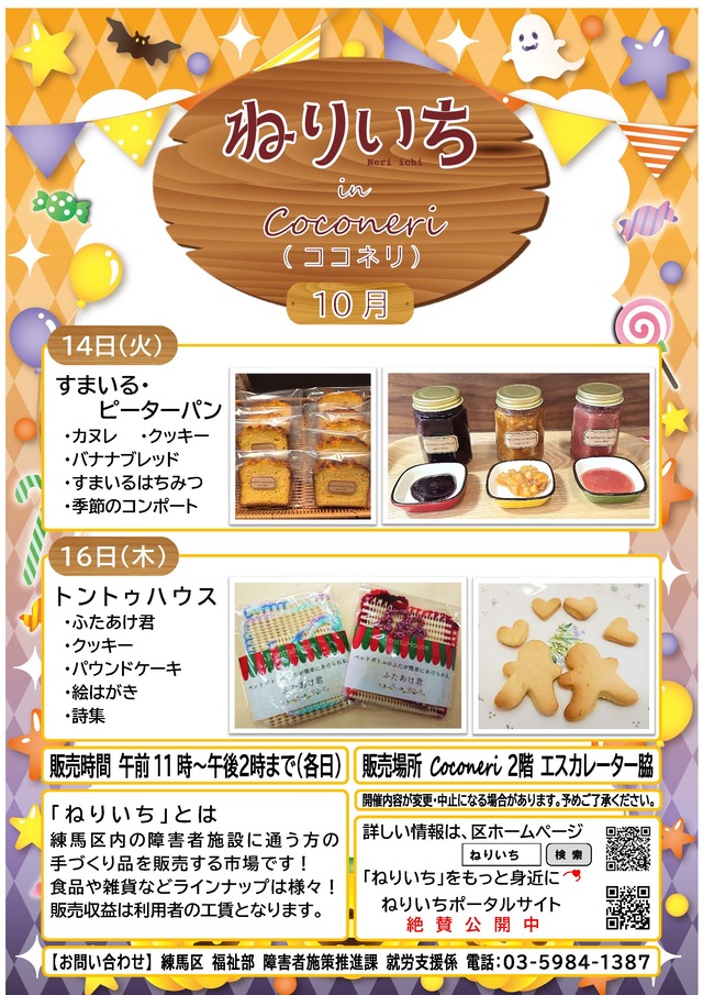 2025/09/29 (月)ねりいち in ココネリ(令和7年10月の予定) 場所:ココネリ2階 エスカレーター脇 時間:午前11時から午後2時まで ※担当施設やスケジュールが急きょ変更になる場合があります。あらかじめご了承ください。