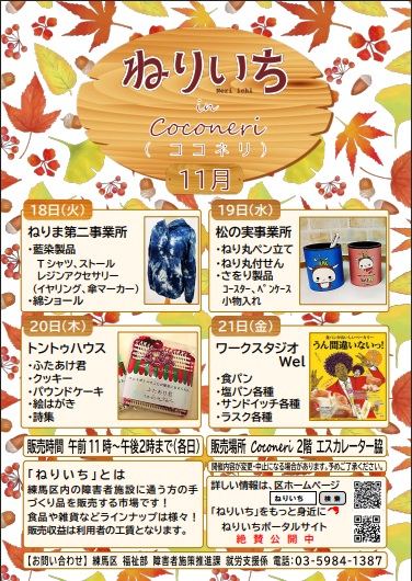 2025/10/31 (金)ねりいち in ココネリ(令和7年11月の予定) 場所:ココネリ2階 エスカレーター脇 時間:午前11時から午後2時まで ※担当施設やスケジュールが急きょ変更になる場合があります。あらかじめご了承ください。