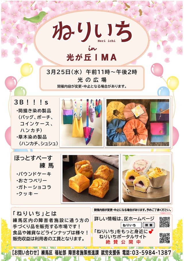 2026/02/26 (木)ねりいち in 光が丘IMA(令和8年3月25日) 練馬区役所アトリウムでおなじみ、障害者施設の手づくり品を集めた「ねりいち」が光が丘IMA1F光の広場で開催されます。 ぜひお立ち寄りください。 場所:光が丘IMA 光の広場 日時:令和8年3月25日(水) 午前11時から午後2時まで ※担当施設やスケジュールが急きょ変更になる場合があります。あらかじめご了承ください。