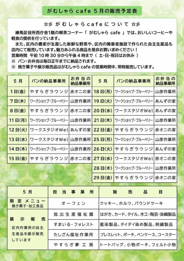2026/04/24 (金)がむしゃらcafe 令和8年5月の販売予定 場所:練⾺区役所⻄庁舎1階の喫茶コーナー 営業日:毎週月曜から金曜(土曜、日曜、祝日はお休み) 営業時間:午前10時30分から午後4時まで ※担当施設やスケジュールが急きょ変更になる場合があります。あらかじめご了承ください。
